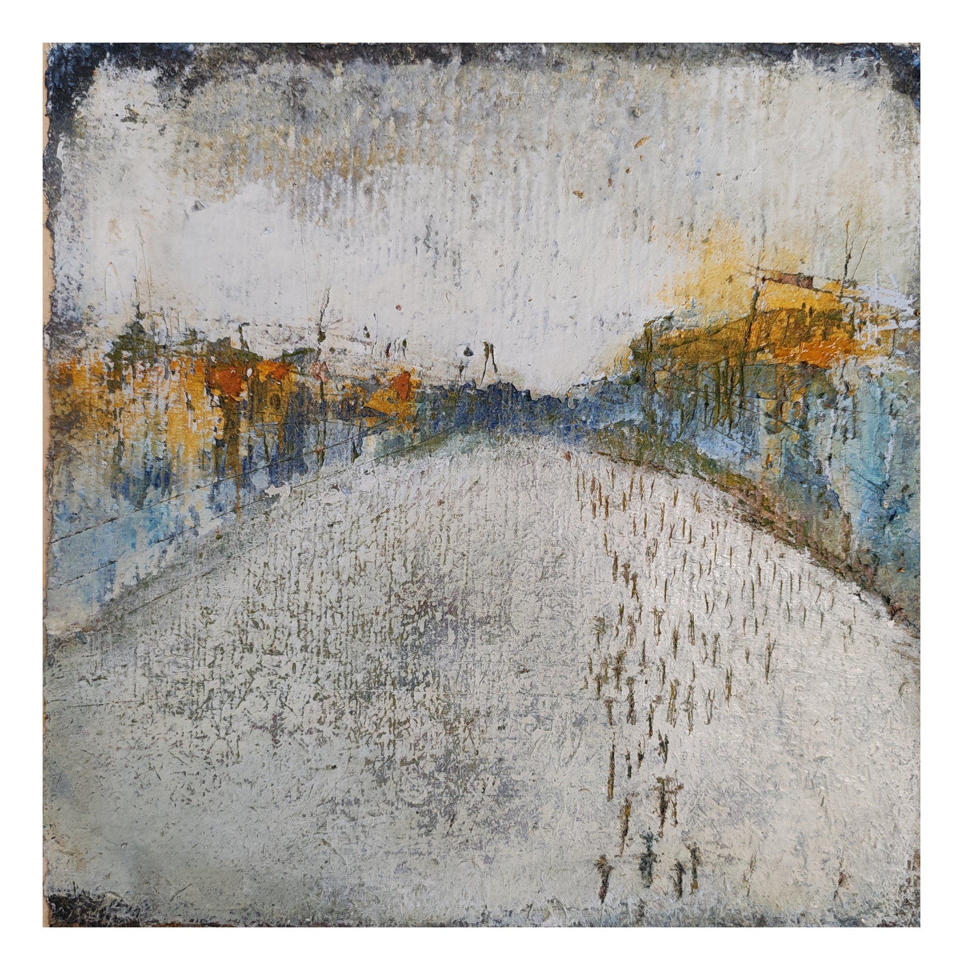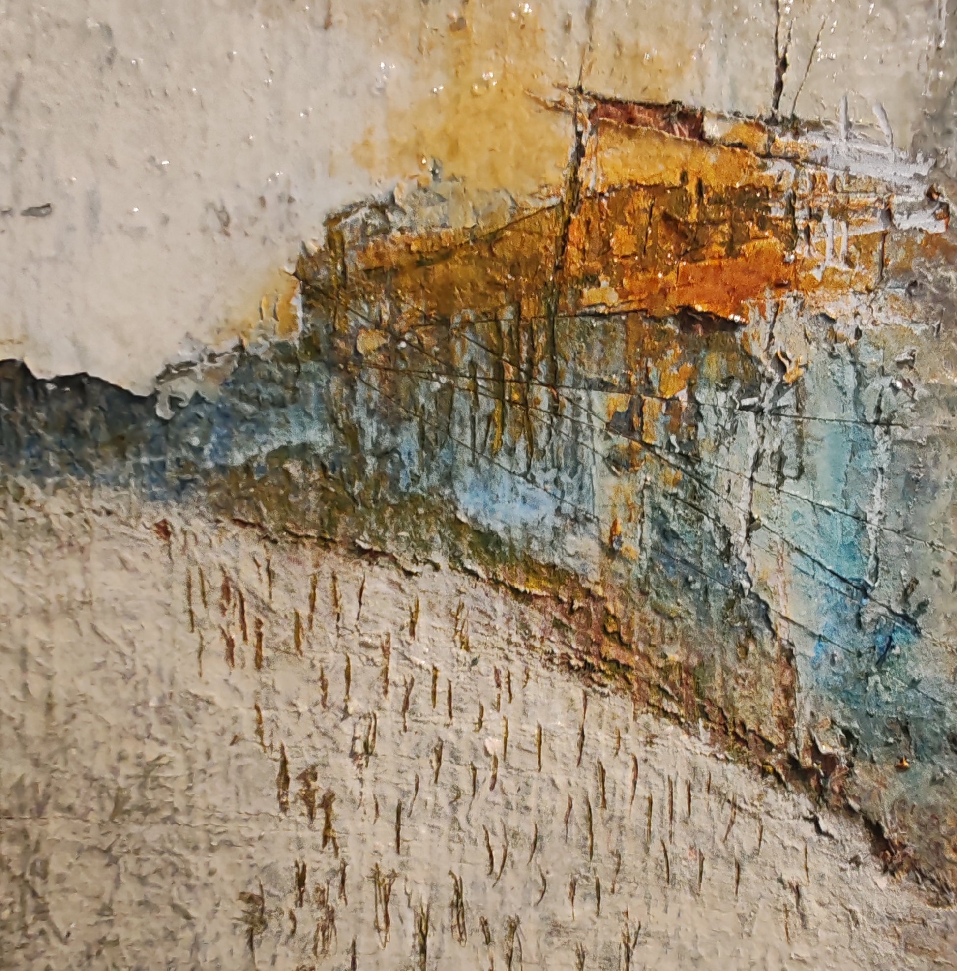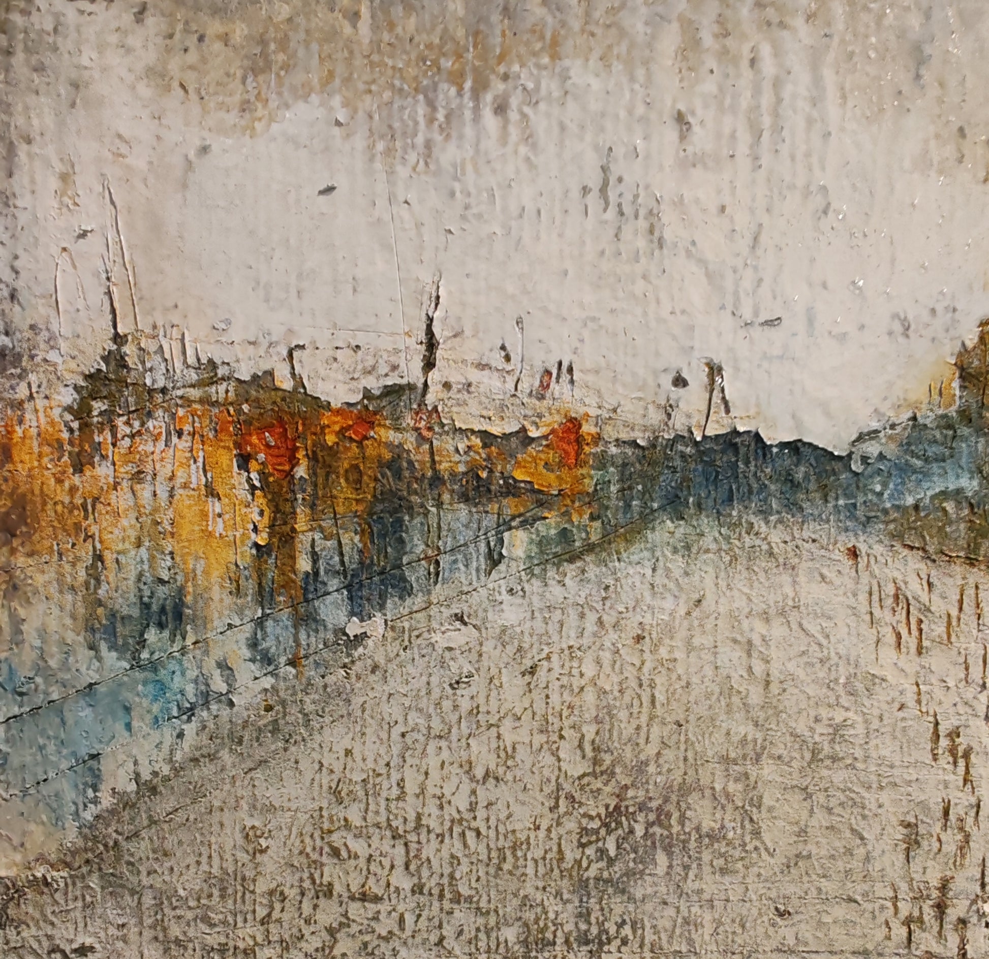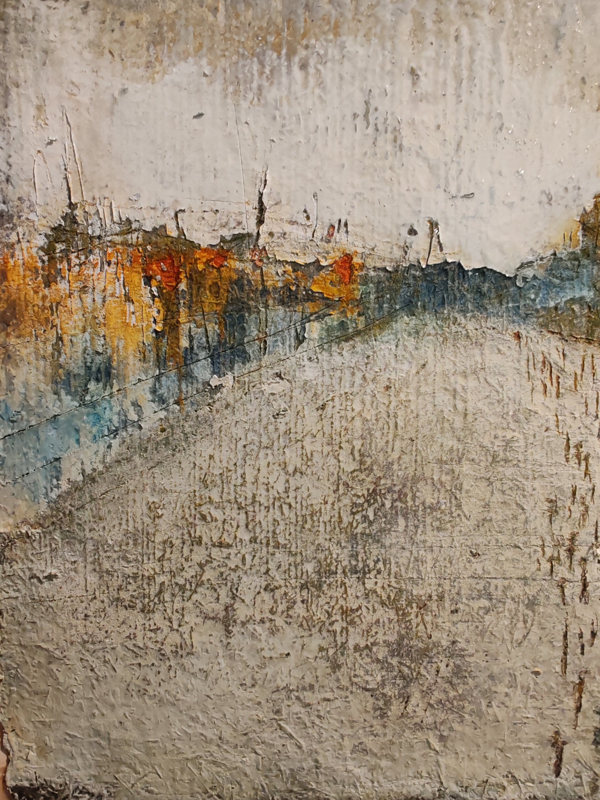 Technique mixte et gravure sur carton entoilé 20x20 cm support sur coffre en bois